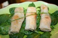 • Humidifiez à l'aide d'eau tiède les feuilles de riz. Ensuite, déposez trois asperges, une crevette et un peu de coriandre sur la partie inférieure de la feuille. Repliez les bords puis, enroulez-les.