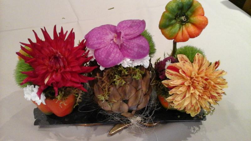 15 jours qu'elle a été réalisée j'ai juste remis des dahlias du jardin l'orchidée VANDA EST ENCORE BELLE les poivrons verts changent de couleurs l'artichaud à séché