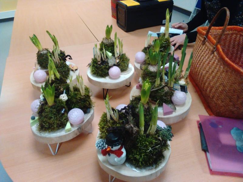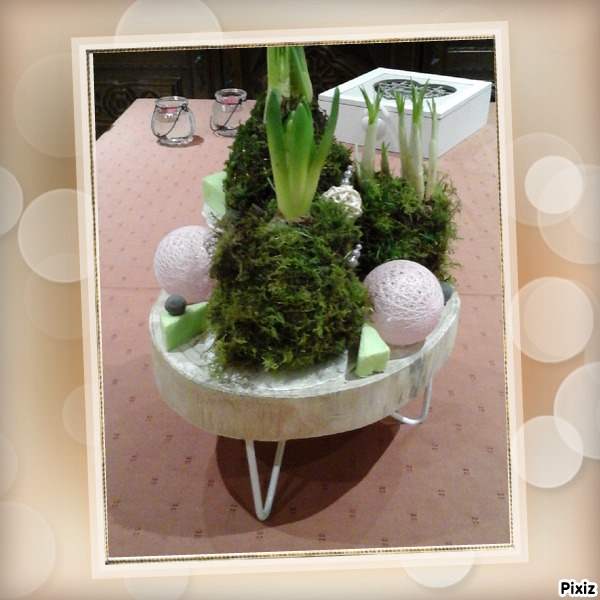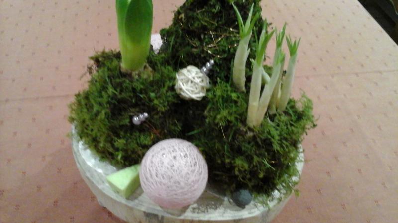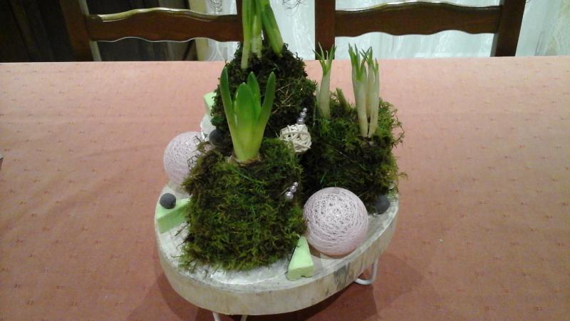 Ce cours nous a permis de réaliser cette compo Sur un support rond en bois Des boules de mousse entoure la jachyntes le sinistre crocus minis narcisses Qq boules de cisale