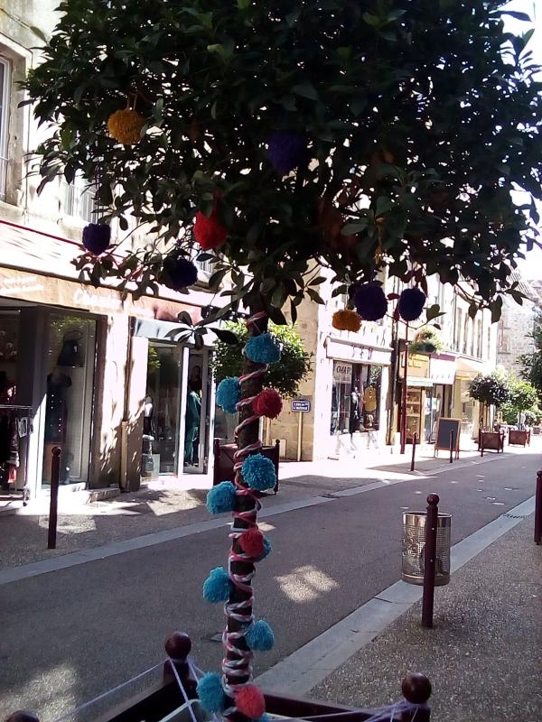 Un arbre original avec des ponpons devant un magasin de laine et mercerie