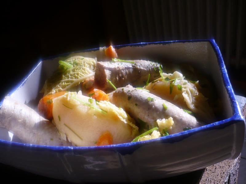 Chou, patate, carotte, thym, laurier, sel, poivre et saucisse, la bonne saucisse, fabriqué dans notre village, par un professionnel !
