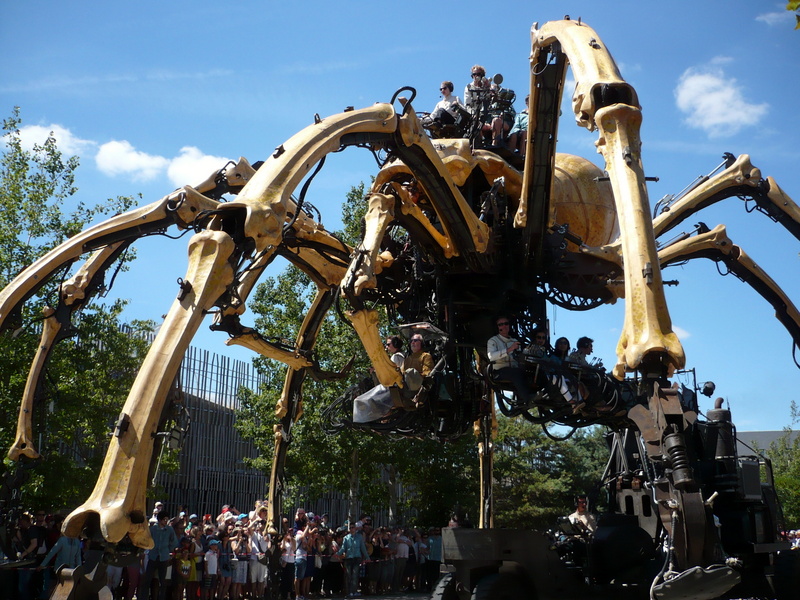 Nantes (Loire-Atlantique), vendredi. Avec ses 13 m de haut et ses 37 t, Kumo a de quoi impressionner. Mais cette araignée géante déployant ses huit pattes articulées et crachant de l'eau ne ferait pas de mal à une mouche. Création de la compagnie la Machine, également à l'origine du Grand Eléphant devenu un symbole de Nantes, Kumo a commencé à se promener dans les rues de la ville vendredi. Les Nantais peuvent la voir en action jusqu'à ce soir dans le cadre de la « Maker Faire », un rassemblement d'inventeurs et de créateurs de tout poil.