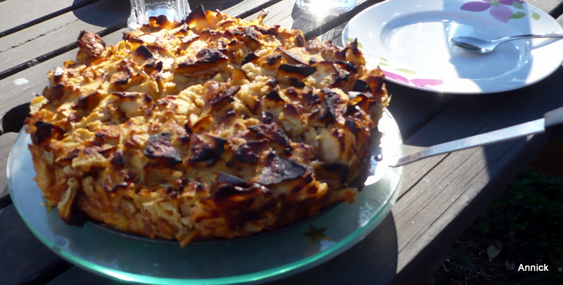 Un dimanche avec un beau soleil, pour recevoir nos amis pour le café! Vite fait un gâteau magique aux pommes avec un petit gout subtil d'amande! Ingrédients: 7 pommes, 2 œufs, 50 gr de sucre, 10 cl de lait, 20 gr de beurre fondu, arôme amande, 70 gr de farine, 1 p de levure! Simple comme bonjour! épluchez les pommes, passez-les à la mandoline pour les trancher finement. Dans un saladier, mélangez tous les ingrédients, versez le mélange sur les lamelles de pomme. Mélangez bien, versez dans un moule beurré, cuisez 35 minutes à 200. Source: http://www.cuisineaz.com/recettes/gateau-magique-aux-pommes Le gâteau magique a été dégusté au jardin ou nous avons papoté devant un bon café.