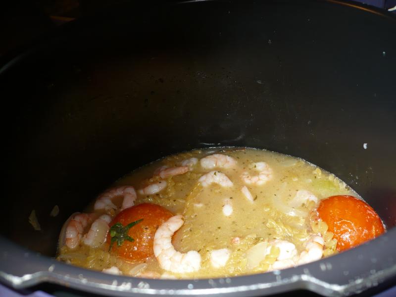 Un paquet de fruits de mer et des tomates du jardin congelées cet été, du persil, un verre de vin blanc, un gros oignon.