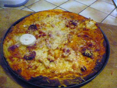 Sauce tomate, lardons fumés, jambon, chorizo, chèvre frais, herbes de provences, gruyère râpé!
