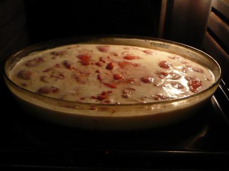 vous beurrez un plat, versez l'ensemble, puis disposez vos pêches.