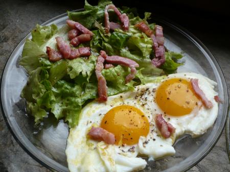 Tout frais du jour c'est un délice, et monsieur Titanique est au fourneau, pour me cuire des œufs sur le plat, salade et lardons!