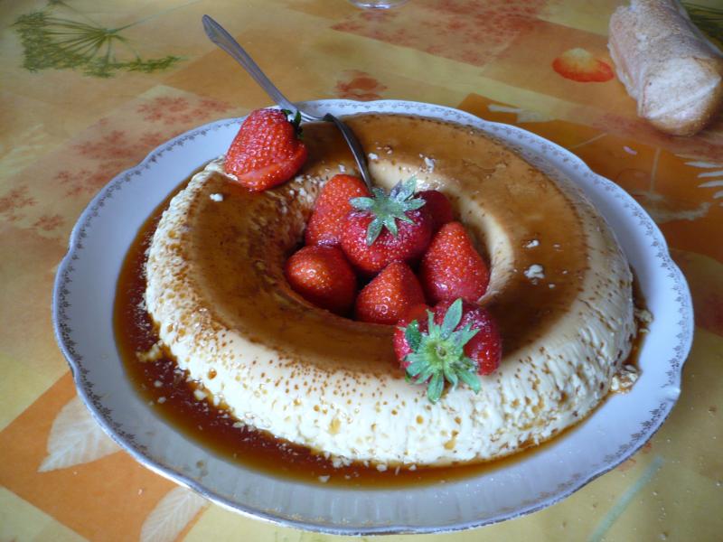 Je me suis faits un plaisir de faire la décoration avec simplement quelques fraises de Plougastel et du sucre. Ingrédients (6 personnes): 5 oeufs Faites bouillir le lait, la crème et la vanille ( Capambrevanille) quelques bulles en surface suffisent, laissez un peu refroidir. Pendant ce temps : Faites un caramel en versant une dizaine de sucres dans un casserole avec un peu d'eau. Arrêter le caramel quand il est blond , Versez le caramel au fond du plat. . , battez les oeufs avec le sucre, Versez le mélange de lait tiédi sur les oeufs. Bien battre. Versez dans le plat. Enfournez au bain-marie (dans un plat rempli d'eau jusqu'à la moitié du plat) pendant 1 heure à 180°C. A la sortie du four laisser à température ambiante avant de mettre au frais. Dégustez bien frais.