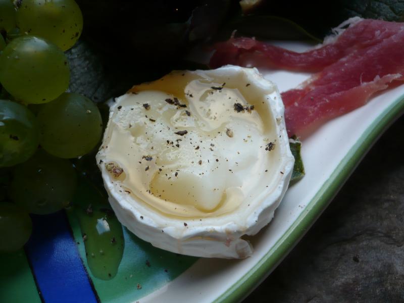 du miel ( de mon village) , une bûche de chèvre lamelles de jambon de pays