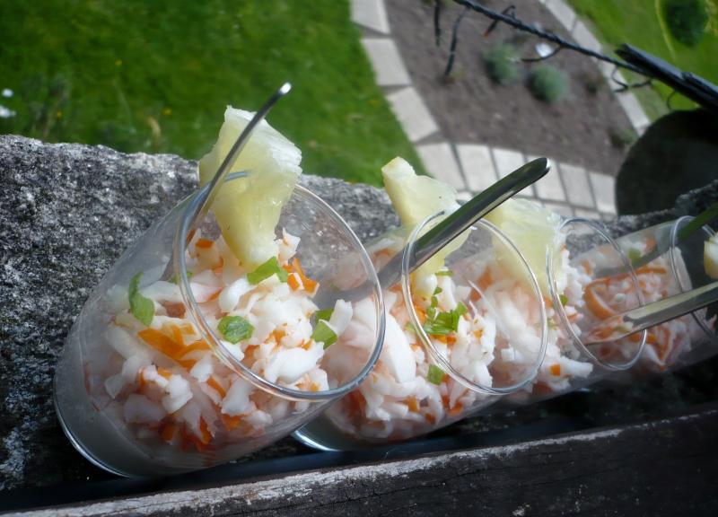 Avec les "bubulles" (champagne) j'ai servi des petites verrines, qui ma fois étaient succulentes. Je vous donnerais la suite de mon petit repas demain! Quelques crevettes fraîchement décortiquer, mixer avec de la crème, poivrer, puis quelque morceaux de crevettes, râpé de surimi (saveur crabe), déco, un peu de vert d'oignon du jardin!