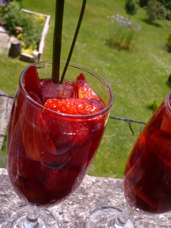 Au moment de l'apéro, je verse un peu de jus de fraise, que j'ai laissé macérer.