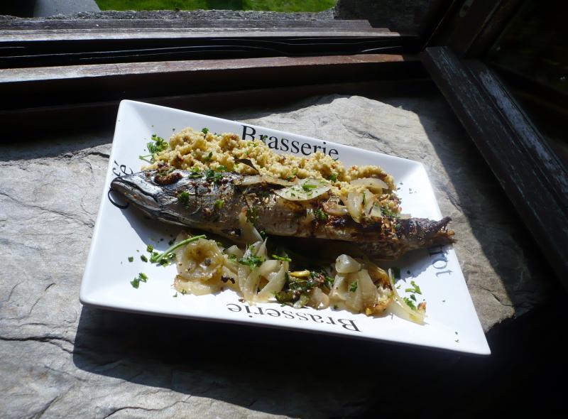 J'ai présentée mes maquereaux, coucher sur un lit d'oignons, avec un boulgour à l'Oriental.