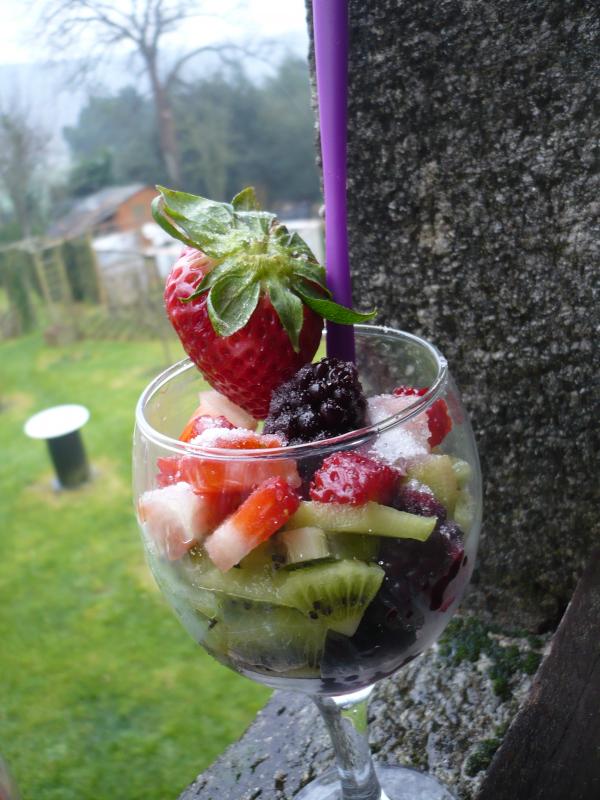 Le fond de la coupe sera rempli de mûres du jardin(congelé de cet été), un kiwi coupé de dès ainsi que des fraises, terminez avec une mûre et une grosse fraise accrochée au verre, une cc de sucre semoule en plus ou nature.