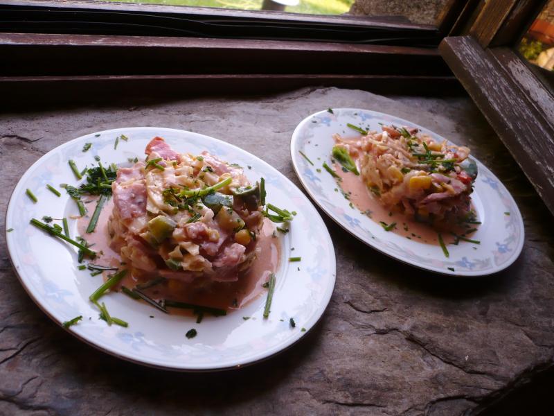 Versez cette sauce sur l'ensemble des ingrédients, mélanger bien, incorporez dans un cercle en tassant bien, enlever le cercle doucement et décorer avec de la ciboule, persil ou autres!
