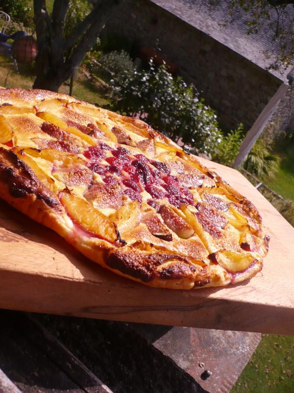 Une tarte qui vient juste de sortir du four, préparée avec les fruits du jardin, framboises, figues, prunes.