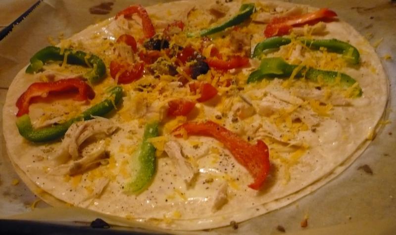 Sur les deux premières galettes garnies de crème et de fromage râpé, en déposer une troisième, la garnir de crème, oignon en lamelles, poivrons en lamelles, lamelles de poulet, saler, poivrer.