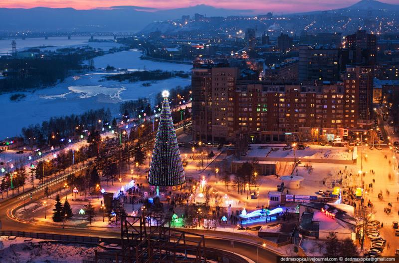 ,,Krasnoïarsk d'hiver — une de ces villes, où on veut revenir. Puisque l'Enissei ne se glace pas, tous les arbres sont enveloppés du givre, а sur la ville il y a souvent une brume et le brouillard. Le présent bel hiver russe!''