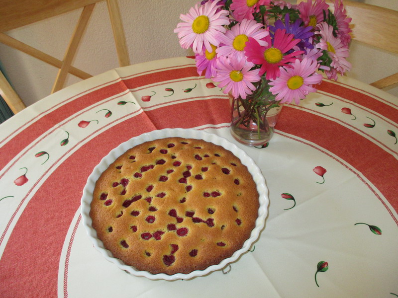 Vérifier la cuisson avec la lame d'un couteau qui doit ressortir sèche (là ou il n'y a pas de framboises !!)