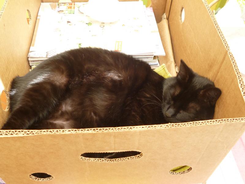 Moi j'aime toujours mon carton, ma maîtresse voudrait pourtant bien avoir la table libre, mais elle n'y touche pas,je suis trop gâtée ...