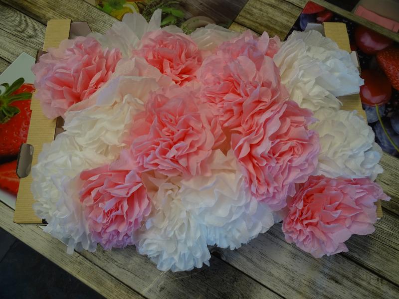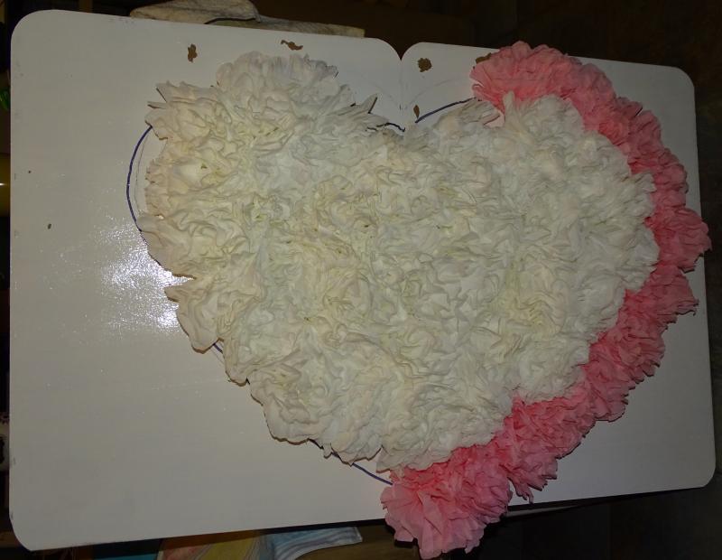 debut du collage, sauf que là avec la photo que je viens de faire çà se voit que pour le blanc nous avons utilisé des serviettes papier différentes, nos avis divergent avec Ray pour savoir si on finit le reste en rose ou si on fini apres le rose en blanc