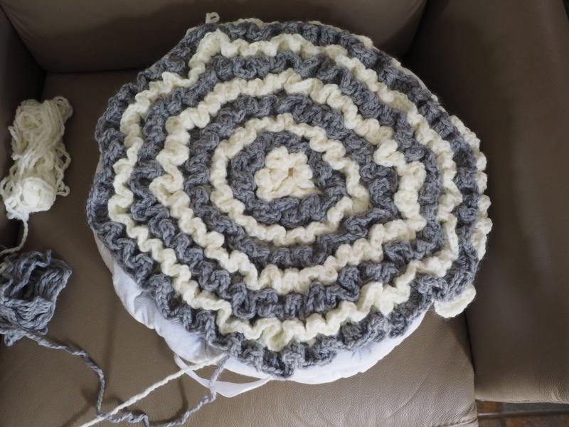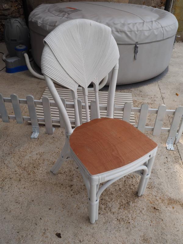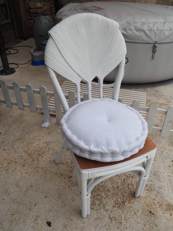 les chaises sont en place, Ray a refait les assises, j'ai enfin trouvé les coussins que je cherchais à Babou