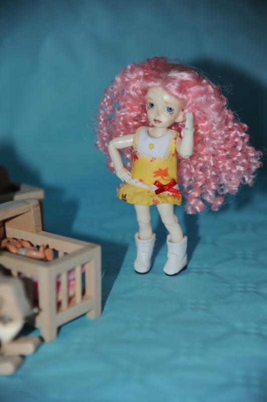 Andréa voulait faire sa belle car elle est ravie d'avoir reçu une nouvelle perruque bouclée rose et des bottines blanches.