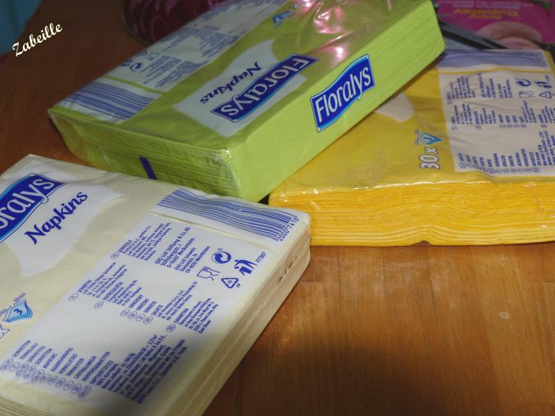 Je me demande bien pourquoi nous avons couru chez Babou, Gifi pour trouver des serviettes papier 3 plis bon d'accord du jaune et du noir, quand j'ai trouvé à lidl pour 60 centimes le paquet de 30 serviettes !!