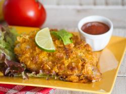 -Mixer ou écraser les biscottes afin de préparer la chapelure.-Répartir dans 3 assiettes différentes la farine, les œufs battus en omelette et la chapelure.-Fariner chaque escalope, les tremper dans les œufs battus puis dans la chapelure.-Faire chauffer de l’huile dans une poêle et faire cuire les escalopes pendant 5 min de chaque côté.-Faire cuire en même temps les tagliatelles dans une casserole d’eau bouillante pendant 10 minutes.-Passer et maintenir au chaud.-Faire de même avec les épinards surgelés. Passer, remettre dans la casserole.-Saler, poivrer et ajouter 2 cuillères à soupe de crème fraîche à 15 % en fin de cuisson.-Mélanger.-Servir chaque assiette avec les escalopes, les pâtes et les épinards.-Verser le coulis de tomate sur les escalopes et parsemer de parmesan râpé et de basilic ciselé.