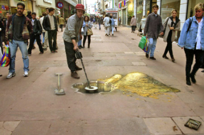 Julian Beever est un artiste britannique vivant en Angleterre. Il est surtout connu pour ses trompe-l'œil au pastel réalisés sur des trottoirs en France, Angleterre, Écosse, Belgique, Pays-Bas, États-Unis, Canada et Australie.Il crée ces oeuvres depuis 10 ans. Ces œuvres, lorsqu'on les regarde sous un angle précis, donnent l'illusion d'être en trois dimensions et de sortir du sol. Elles sont peintes au moyen d'une technique de projection appelée anamorphose et paraissent défier les lois de la perspective. Une anamorphose est une déformation réversible d'une image à l'aide d'un système optique - tel un miroir courbe - ou un procédé mathématique. L'anamorphose désigne également la déformation de l'image d'un film ou d'une émission de télévision à l'aide d'un système optique ou électronique afin de l'adapter à un écran informatique ou de télévision (Format large anamorphosé, 4/3 ou 16/9).