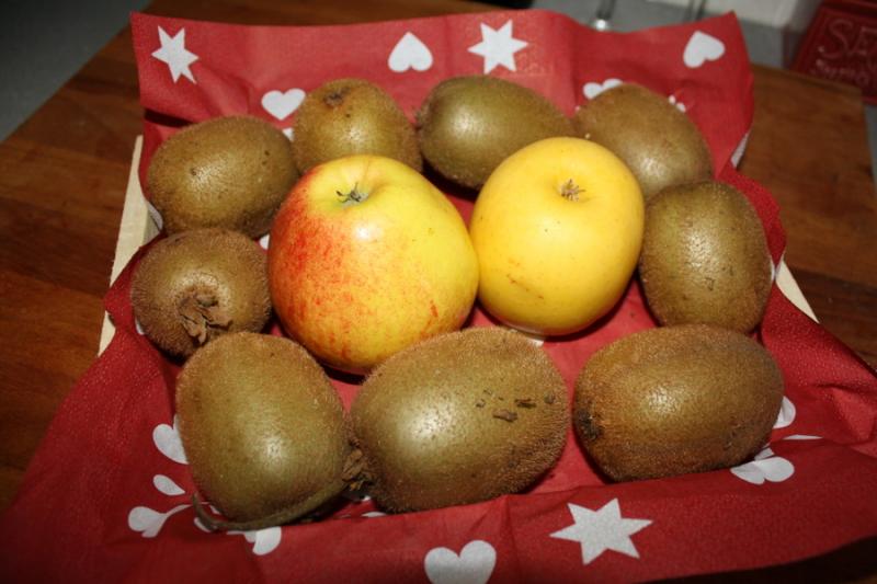 Ils sont donc venus nous rendre visite, avec leur fille Magalie et leur gendre Damien; Annick vous en a parlé sur son blog... Lors de cette visite, Magalie et Damien nous ont apporté des kiwis venant de leur jardin,.... Ces kiwis étaient beaux, mais pas très mûrs, je les ai donc aidés à mûrir en les plaçant à côté de pommes!