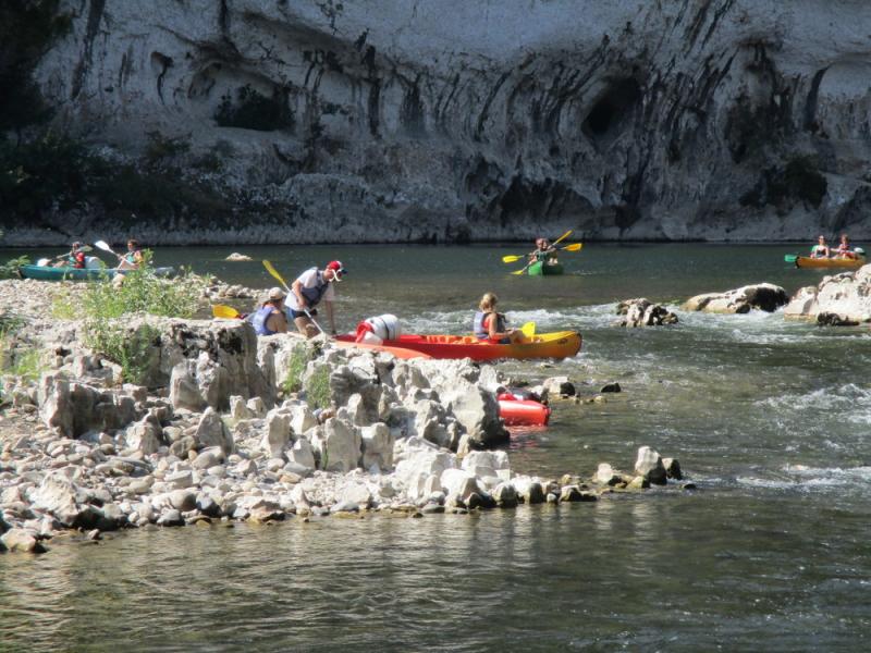 Mais la descente est assez laborieuse par endroit car l'Ardèche a un niveau très bas après 4 mois sans pluie, et il ne faut pas hésiter à mouiller le maillot, en descendant du canoë pour le pousser et même le débloquer pour pouvoir repartir....
