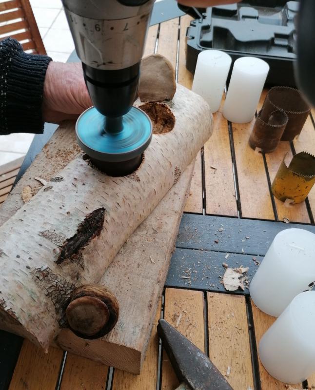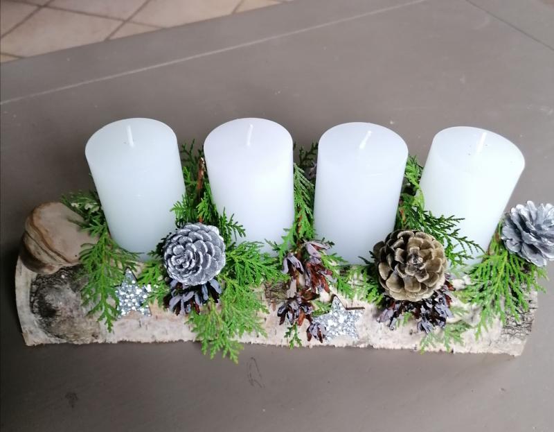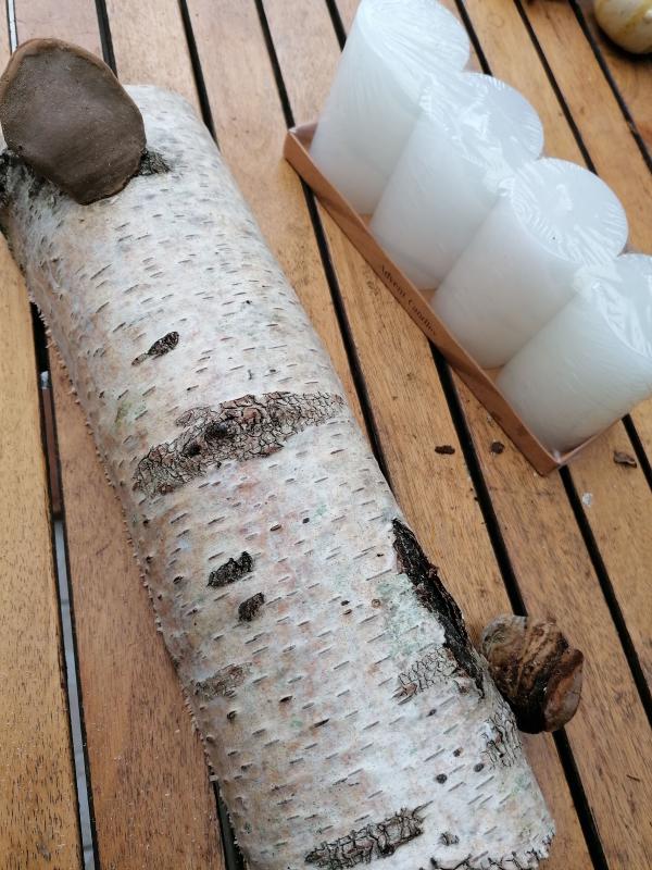 Je ferai mieux de dire 'ma bûche de l' Avent'! Une bûche en bouleau (avec 2 petits champignons), 4 bougies et un mari bricoleur....