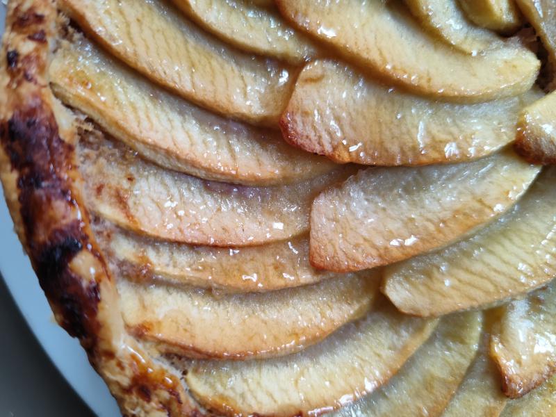 Facultatif ; pour une plus jolie présentation, quand votre tarte a légèrement tiédie, vous pouvez la napper délicatement avec un pinceau trempé dans un peu de gelée de pommes ou de coing, liquéfiée au micro-ondes.