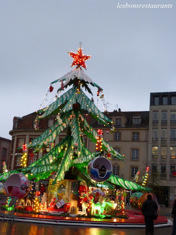 Sur la première photo, vous avez le sapin de Noël de la ville de Metz. Dressé devant la gare, ce conifère agé de 60 ans a été coupé en lisière de la forêt de Liézey dans les Vosges, près de Gérardmer. Il mesure 24 mètres et pèse 7,5 tonnes! Sur cette seconde photo, vous avez le sapin qui illumine le rond-point du centre ville! Avançons plus avant dans Metz.....place de la République.....un bien joli sapin....manège d'un jour....manège de fête!