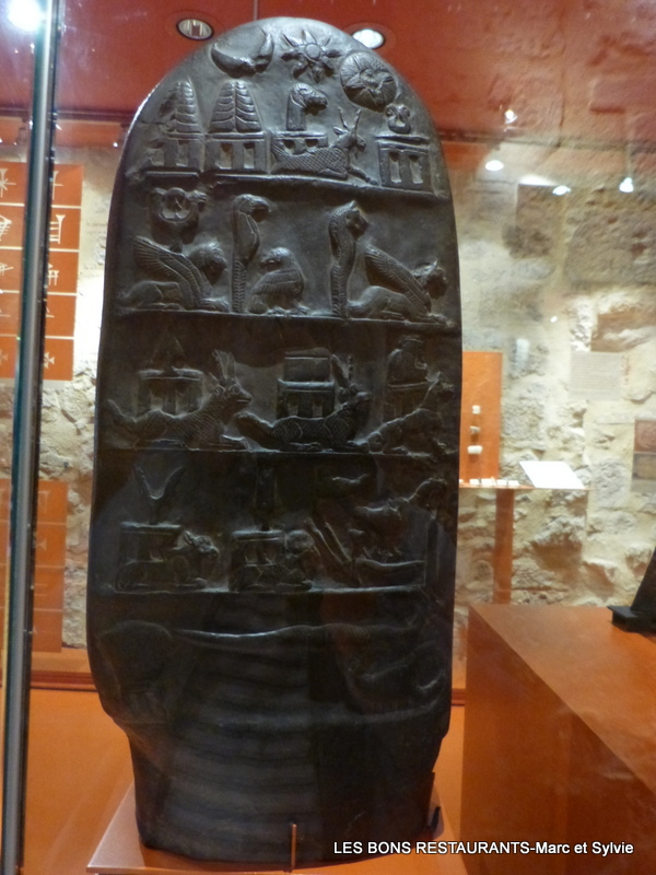 À l'époque kassiste, 12e siècle avant J.C., les kudurrus marquent les donations de terres. La stèle est érigée dans un temple et elle est placée sous la protection des divinités qui y figurent! Tête d'homme!