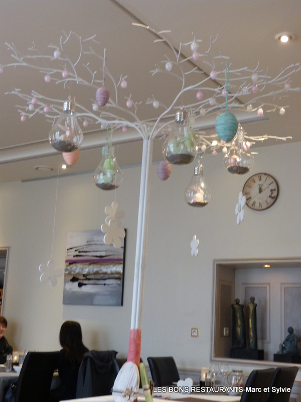 Sur chaque table une décoration nous rappelait que le lièvre de Pâques allait bientôt nous offrir chocolats et bonbons!