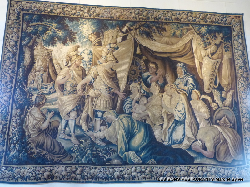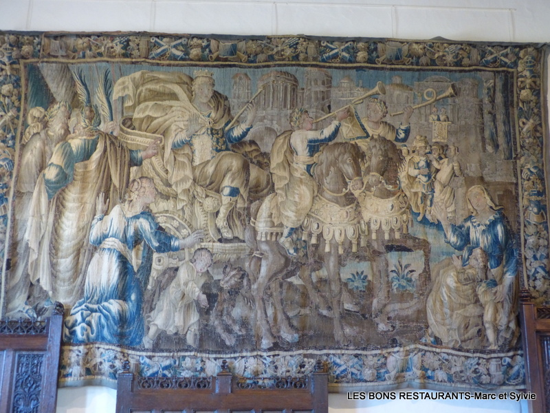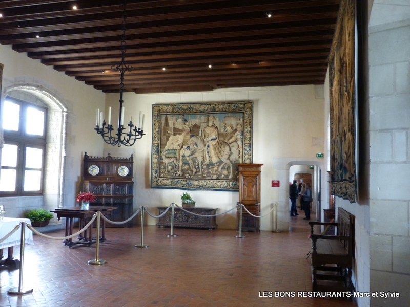 Mais qu'est-ce qu'un échanson? Un échanson était un officier chargé de servir à boire à un roi, un prince ou à tout autre personnage de haut rang. En raison de la crainte permanente d'intrigues et de complots, la charge revenait à une personne en qui le souverain plaçait une confiance totale. L'échanson devait en particulier veiller à écarter tout risque d'empoisonnement et parfois même goûter le vin avant de le servir. Vous pouvez voir ou revoir la visite du château d'Amboise depuis le début en cliquant sur ce lien! Cliquez sur les photos pour les agrandir! Les murs de cette pièce sont décorés de tapisseries d'Aubusson du 17e siècle d'après des cartons de Le Brun.