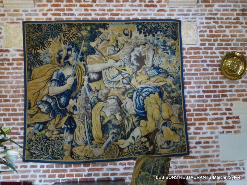 Elle représente différentes scènes de chasse à la faune imaginaire et fabuleuse. En sortant de la chambre nous descendons le grand escalier et nous sommes attirés par une belle tapisserie!