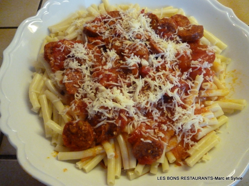 Versez les tomates pelées et hachées grossièrement.Salez, poivrez.Laissez mijoter pendant 20 minutes.Pendant ce temps, faites cuire les macaronis "al dente"!Égouttez-les et mélangez-les à la sauce.