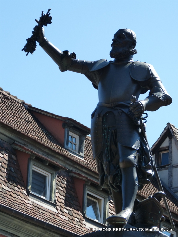 La statue représente Lazare de Schwendi (1522 - 1583), chef de guerre de l'empire et seigneur du Hohlandsbourg. Selon la légende, le plant de vigne qu'il brandit serait le cépage de Tokay qu'il aurait ramené de ses campagnes en Hongrie.