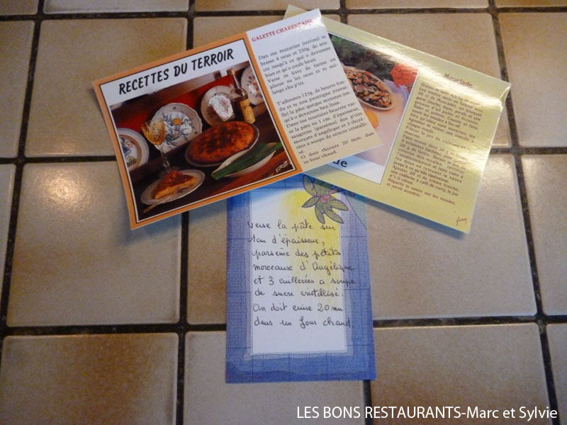 Ce jour là Maryse nous a gâtés car elle nous a envoyé deux cartes postales "recettes"! La première est la recette de la mouclade! Nous avons eu l'occasion de goûter à ce plat et nous avions beaucoup aimé! La seconde recette est une spécialité, la galette charentaise! Cette carte présente la recette dans le patois du pays et Maryse a eu la gentillesse de nous la traduire! Il n'y a plus qu'à cuisiner! Merci beaucoup Maryse pour ta gentillesse!