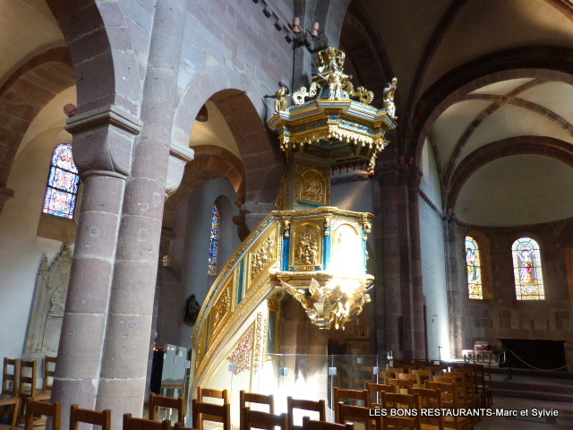 La crypte, ainsi que quelques remplois sculptés témoignent de cette église primitive, construite par Hildegarde de Mousson-Montbéliard qui fut une mécène allemande du haut Moyen Âge. La chaire, en bois polychrome, est réalisée en 1733, d'après le programme iconographique du père jésuite Ignace Saint-Lô, mais le sculpteur est inconnu.