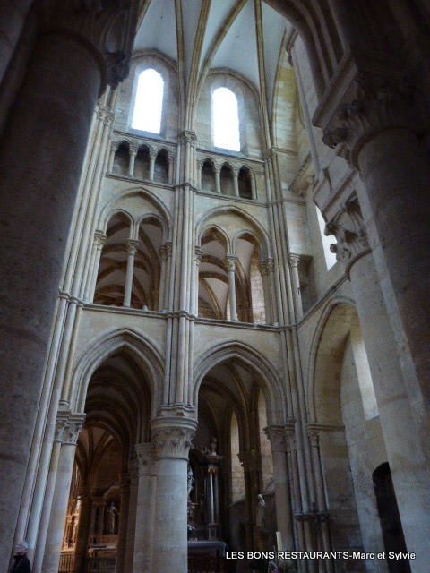 Cette cité fut à l'origine un marché gaulois puis un poste romain sur la voie Reims-Trêves. Devenue cité-frontière, Mouzon se développa et pris une importance stratégique en devenant une ville fortifiée! Après avoir fait le tour extérieur de l'abbatiale poussons la porte de cette belle forteresse! Vous pouvez voir ou revoir la visite de Mouzon depuis le début en cliquant sur ce lien! Cliquez sur les photos pour les agrandir! (10 clichés) La nef, entourée de deux collatéraux, se livre dès l'entrée au regard du visiteur, avec son élévation en trois étages, caractéristique du style gothique primitif. Le niveau inférieur est celui des grandes arcades en arcs brisés, s'appuyant sur des piliers ronds à tailloirs circulaires.