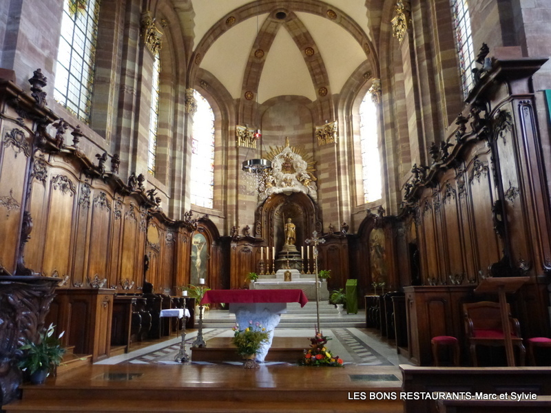 Les deux atlantes en bois qui se situent sur les tourelles en bois figurent l’allégorie de la jeunesse et de la vieillesse. L’ensemble de la décoration est de style Louis XV tardif voire Louis XVI. Dans le prolongement de la grand’nef, le chœur profond est à deux travées et à abside circulaire.