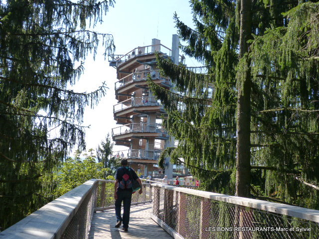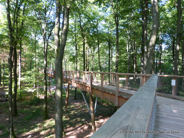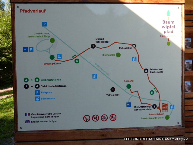 D'une longueur totale de 1250 mètres et d'une hauteur de 3 à 23 mètres, le sentier des cimes serpente parmi les hêtres, chênes et douglas en direction de la boucle de la Sarre.