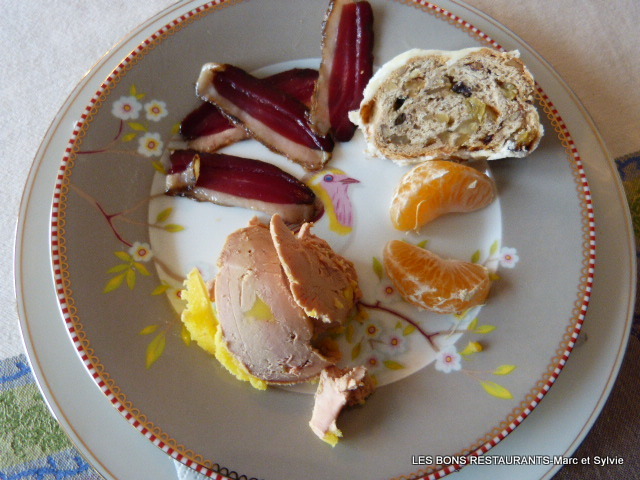 Ce jour là le foie gras était au rendez-vous et, autour de lui, du magret de canard, des clémentines et une tranche de pain ressemblant à du stollen.