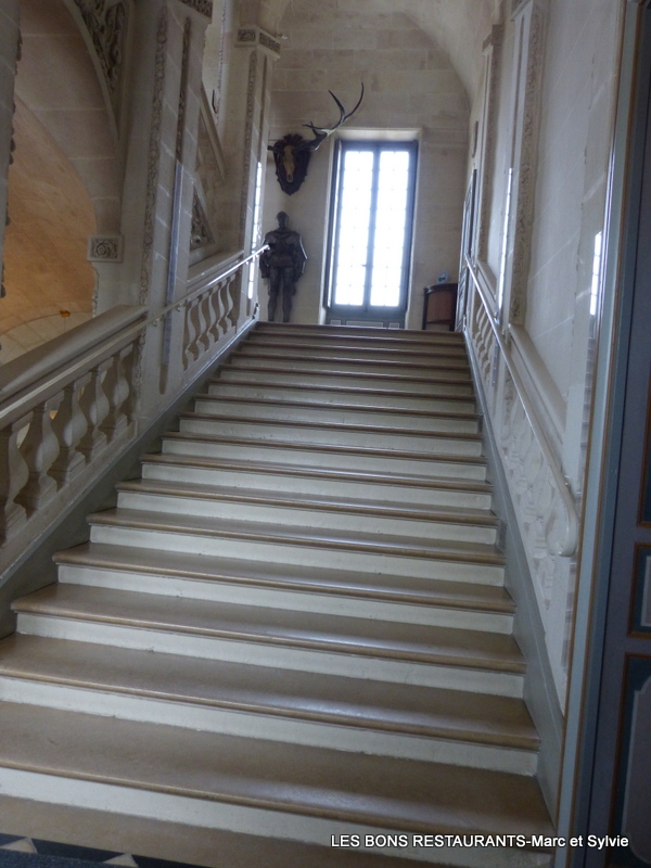 Un escalier de pierre de style classique s'élève sous une voûte en berceau, datant de Louis XIII, à montée droite, contrairement à ceux de Chambord ou de Blois qui sont à spirale. Il est orné de sculptures champêtres, mêlées de motifs guerriers et de symboles des arts, sculptés directement dans la pierre.