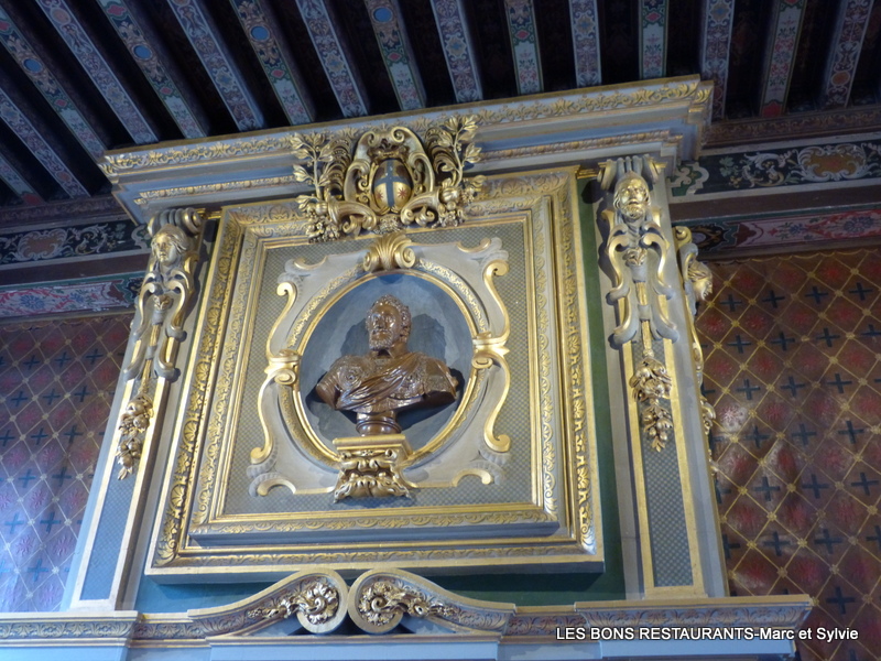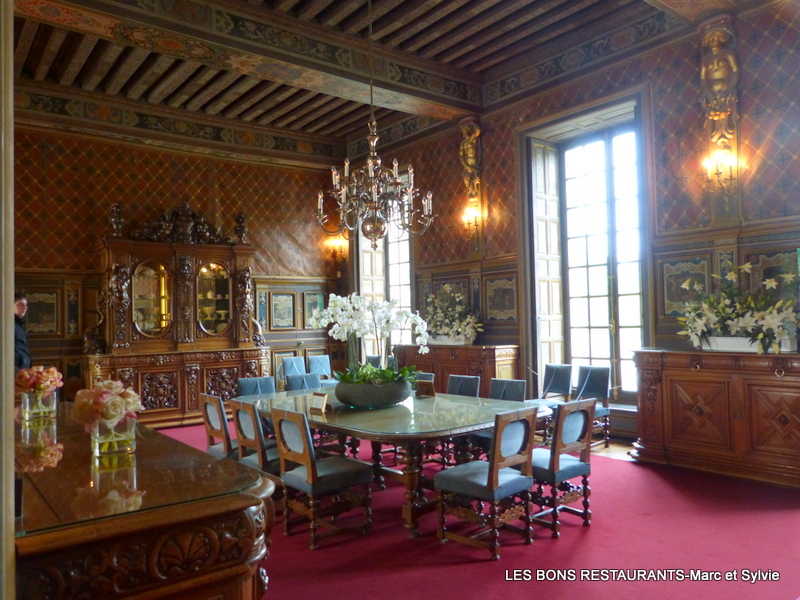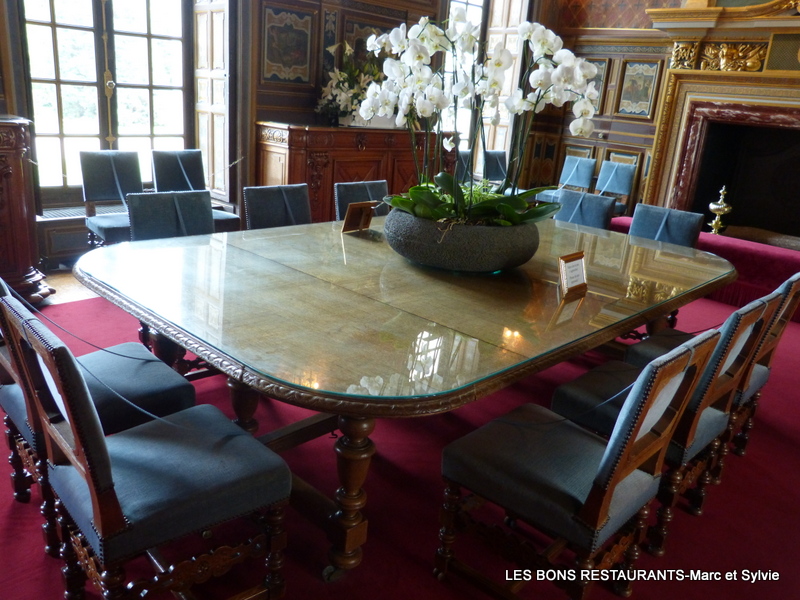 Au-dessus de la table en bois, pouvant accueillir plus de 25 convives, un lustre hollandais du 18e siècle en bronze massif argenté. La cheminée monumentale, de style néo-Renaissance, dorée à l'or fin, est surmontée d'un buste du roi Henri IV.