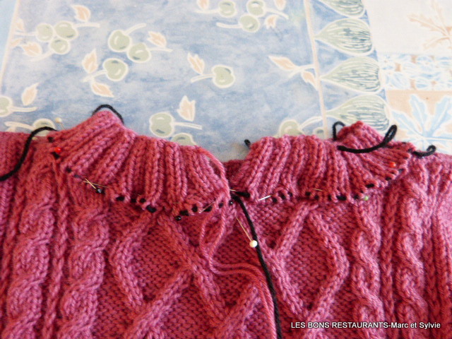 J'ai réparti mes mailles en partant du milieu arrière et en épinglant sur la couture de l'épaule droite, sur le milieu du devant, sur la couture de l'épaule gauche pour finir sur le milieu arrière. Le travail se fait sur l'endroit.