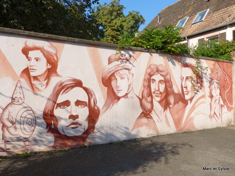 En nous baladant dans la cité bien sympathique de Guebwiller, en Alsace, nous avons eu le loisir d'admirer cette magnifique peinture murale qui orne le théâtre de Guebwiller.